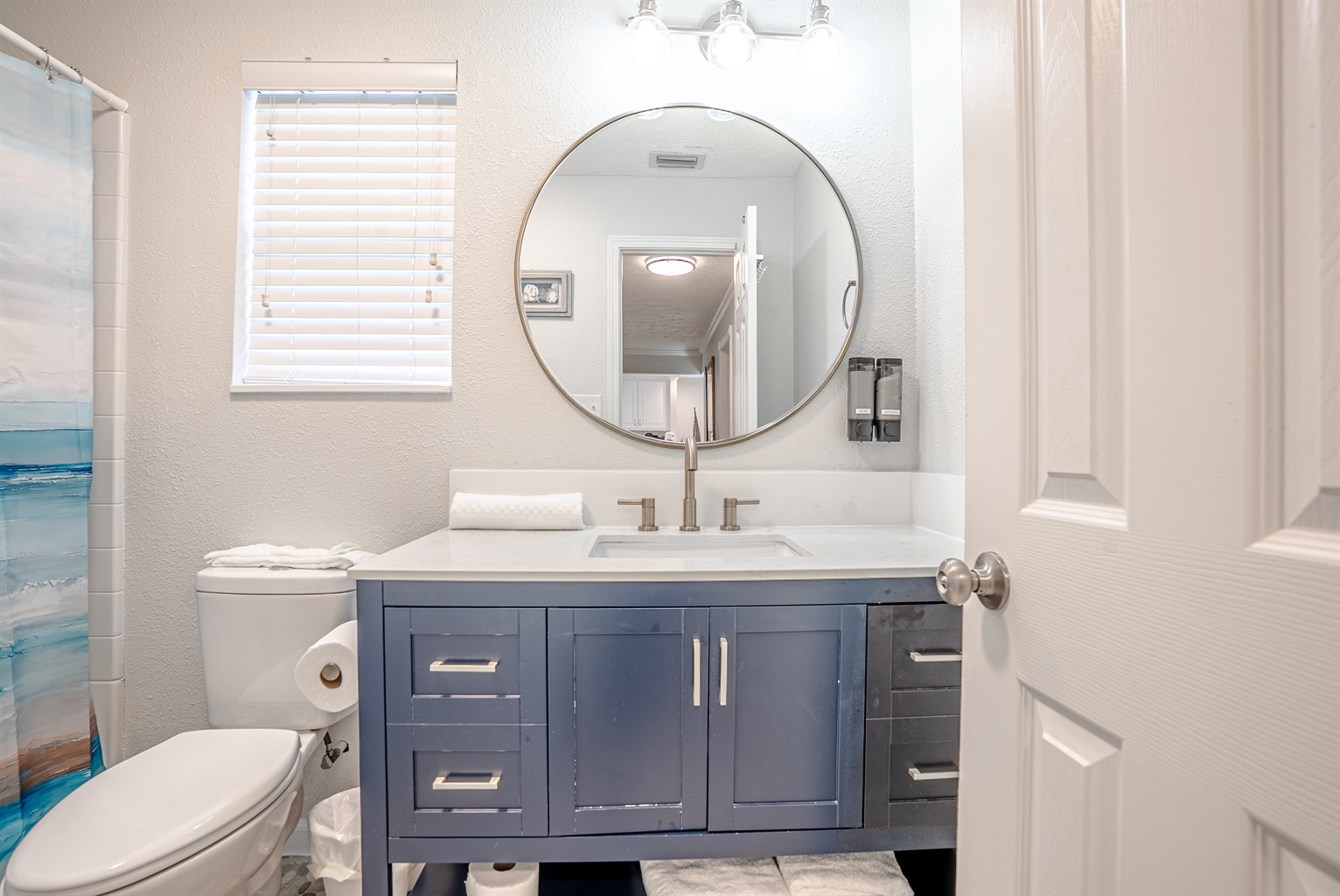 Bathroom 1: Convenient to the front master and bunk room, features a walk-in shower and complimentary toiletries